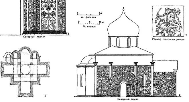 Реконструкция Н.Н. Воронина. Георгиевский собор в Юрьев-Польском. Северный фасад и план. Источник: http://tehne.com/event/arhivsyachina/srednevekovaya-vladimiro-suzdalskaya-arhitektura#5