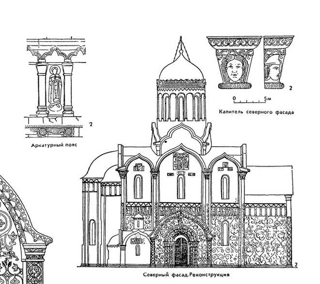 Другая реконструкция Георгиевского собора в Юрьеве-Польском. Северный фасад и детали. Автор: Н.Н.Воронин Источник: http://tehne.com/event/arhivsyachina/srednevekovaya-vladimiro-suzdalskaya-arhitektura#5