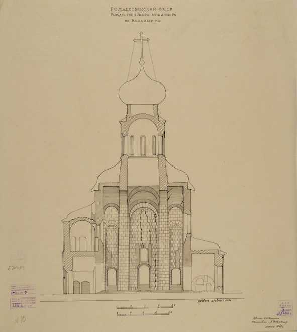 Собор Рождественского монастыря во Владимире (1190-е гг.) Автор: Н.Н.Воронин. Копия 1949 г. Источник: https://www.culture.ru/institutes/13829/sobor-rozhdestvenskogo-monastyrya#materials-1