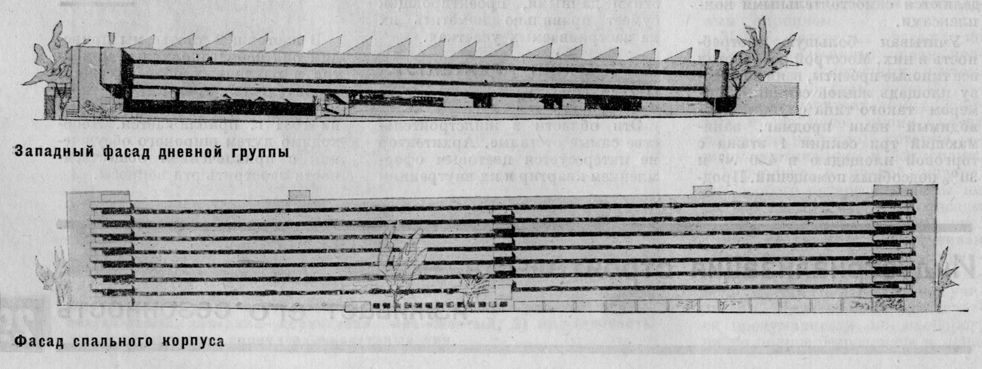 К основному строению на опорах с одной стороны примыкает большой блок коммунальных служб (ныне закрыт). Кульминацией сооружения был открытый каркасный солярий. Передний, или восточный, фасад здания определяется широкими горизонтальными линиями оконных проемов, а на нижних этажах — соединяющимися балконами.