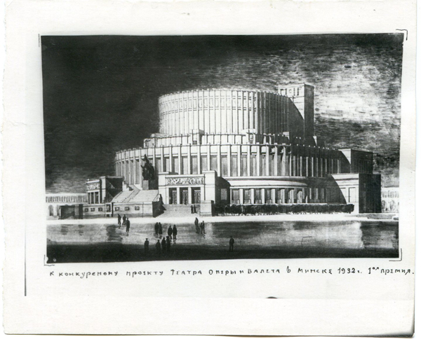 Театр оперы и балета в Минске. Проект. Общий вид. Конкурсный проект. 1-ая премия, 1932 год. Иосиф Лангбард . Фото с сайта: https://www.hata.by/architecture/iosif_langbard_minskaya_opera-4959/
